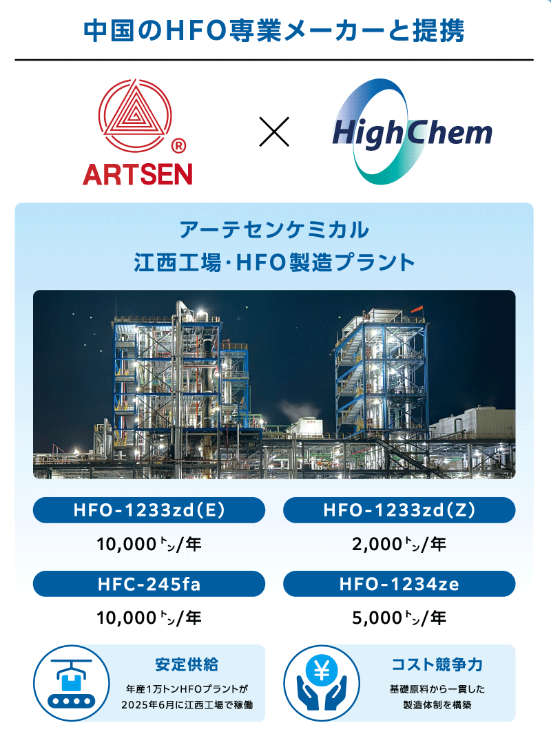 オゾン層破壊係数(ODP)ゼロ、地球温暖化係数1未満、不燃性、低毒性を特長とする環境配慮型のHFO(ハイドロフルオロオレフィン)製品です。